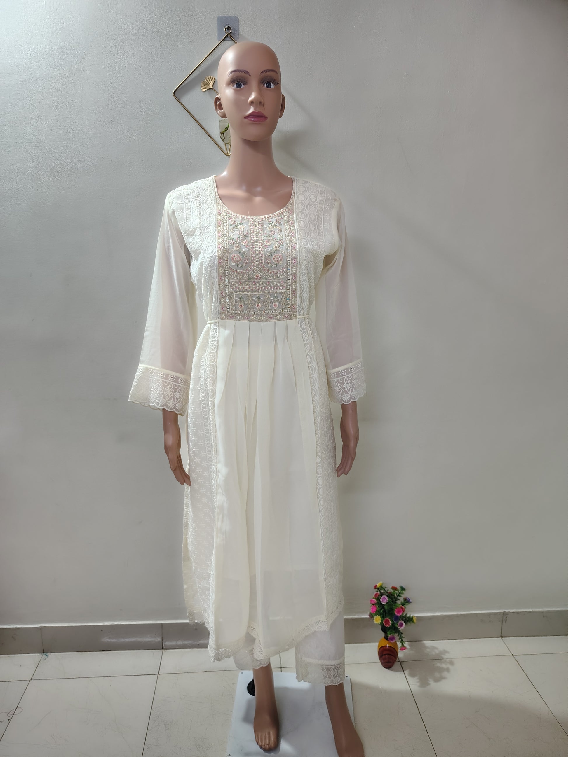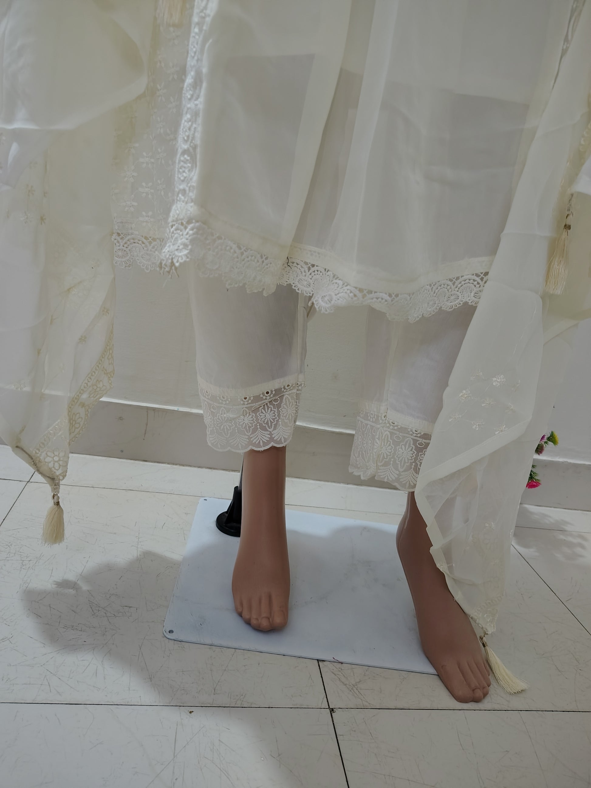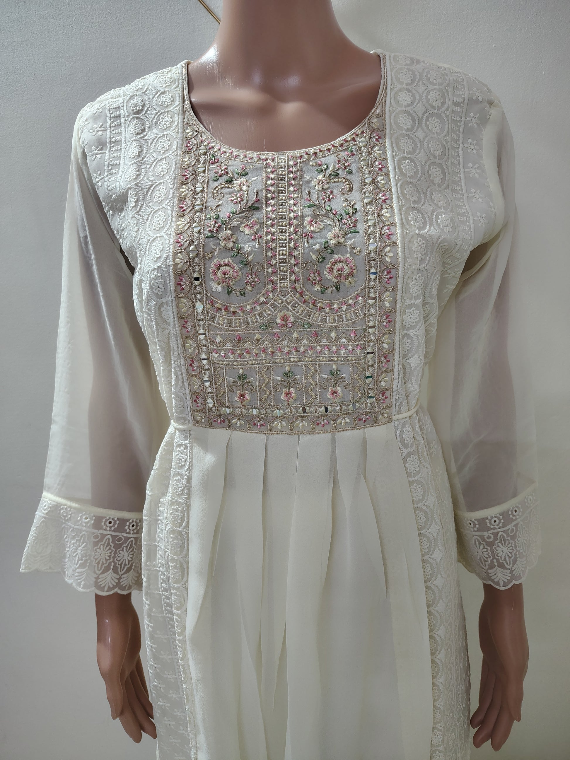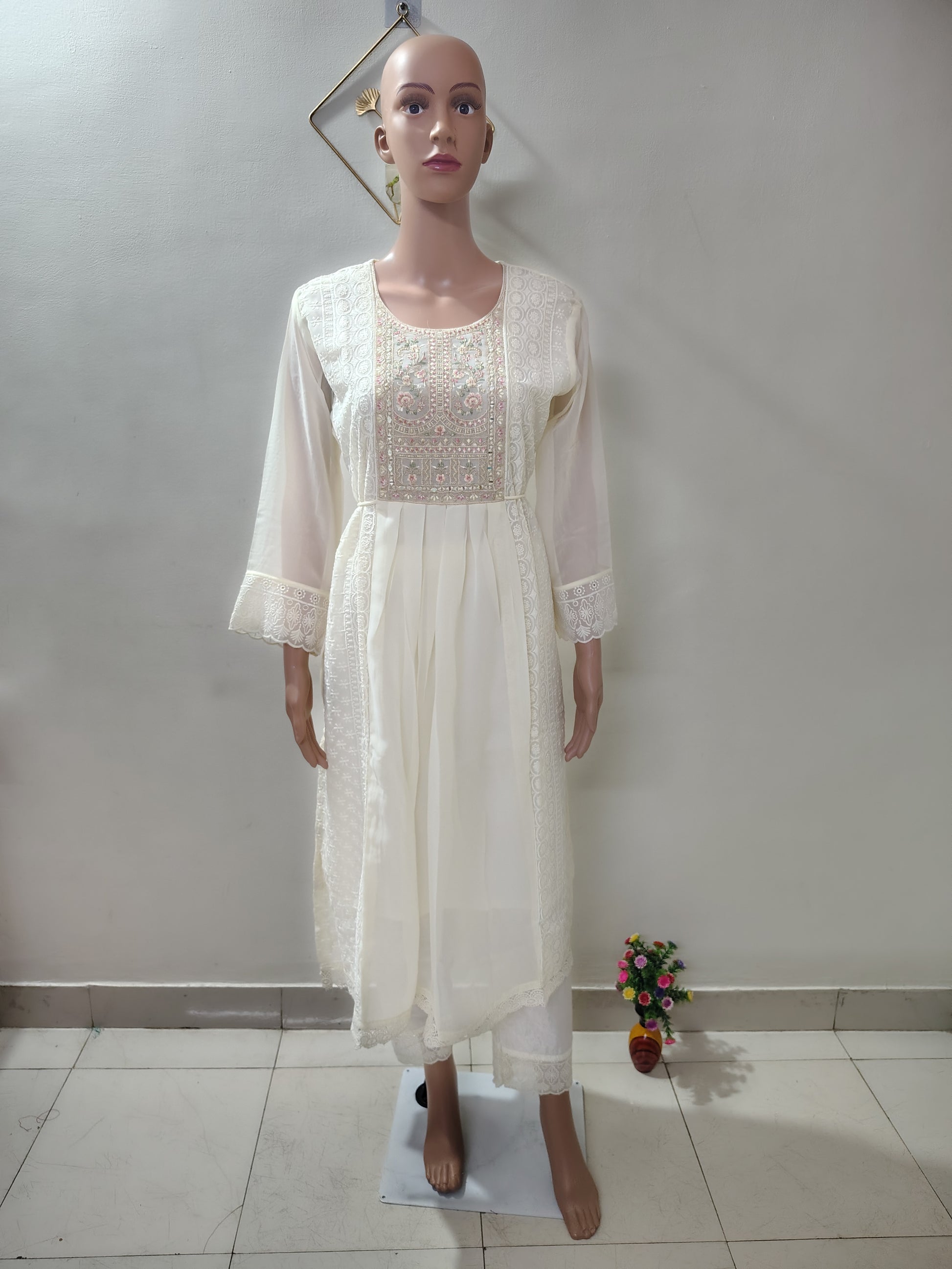 Elevate your ethnic wardrobe with this elegant ivory georgette kurta set featuring intricate thread work embroidery on the neckline. Designed with delicate lace detailing and a flowy silhouette, this premium outfit offers a graceful and feminine look. The soft georgette fabric ensures lightweight comfort, making it perfect for festive occasions, family gatherings, parties, and special celebrations. Paired with matching bottoms and a coordinated dupatta, this timeless white ethnic set blends sophistication with modern charm.