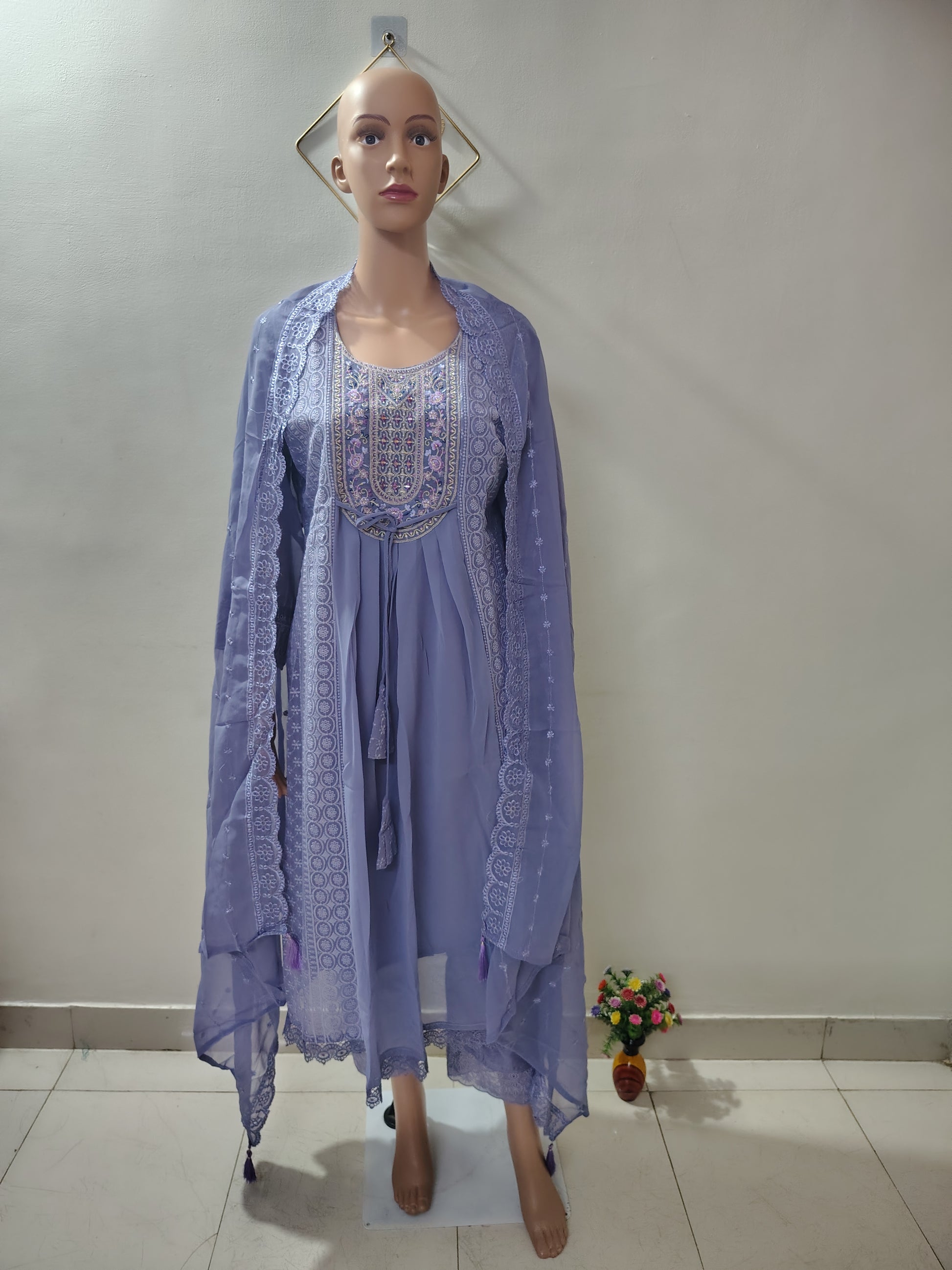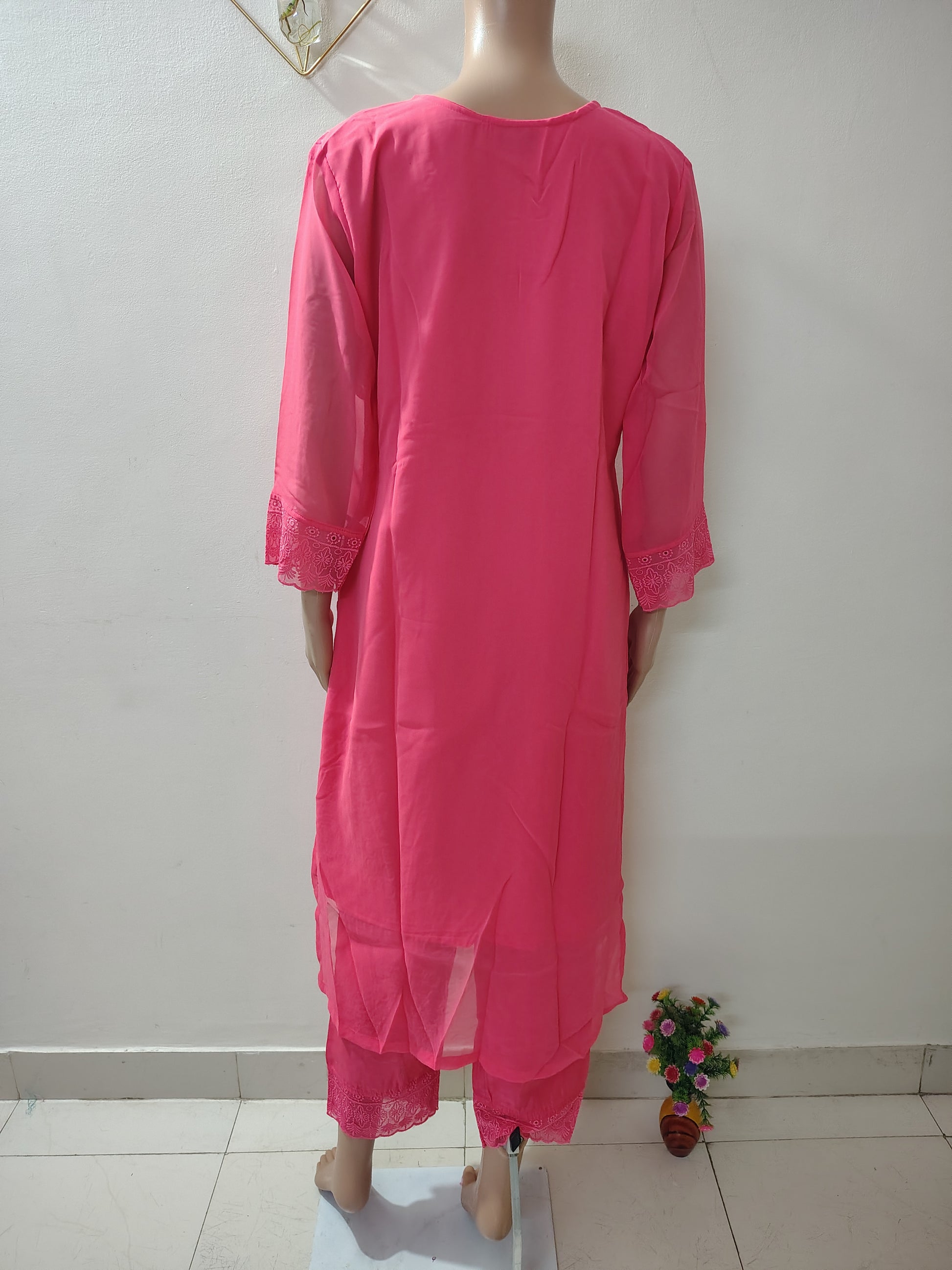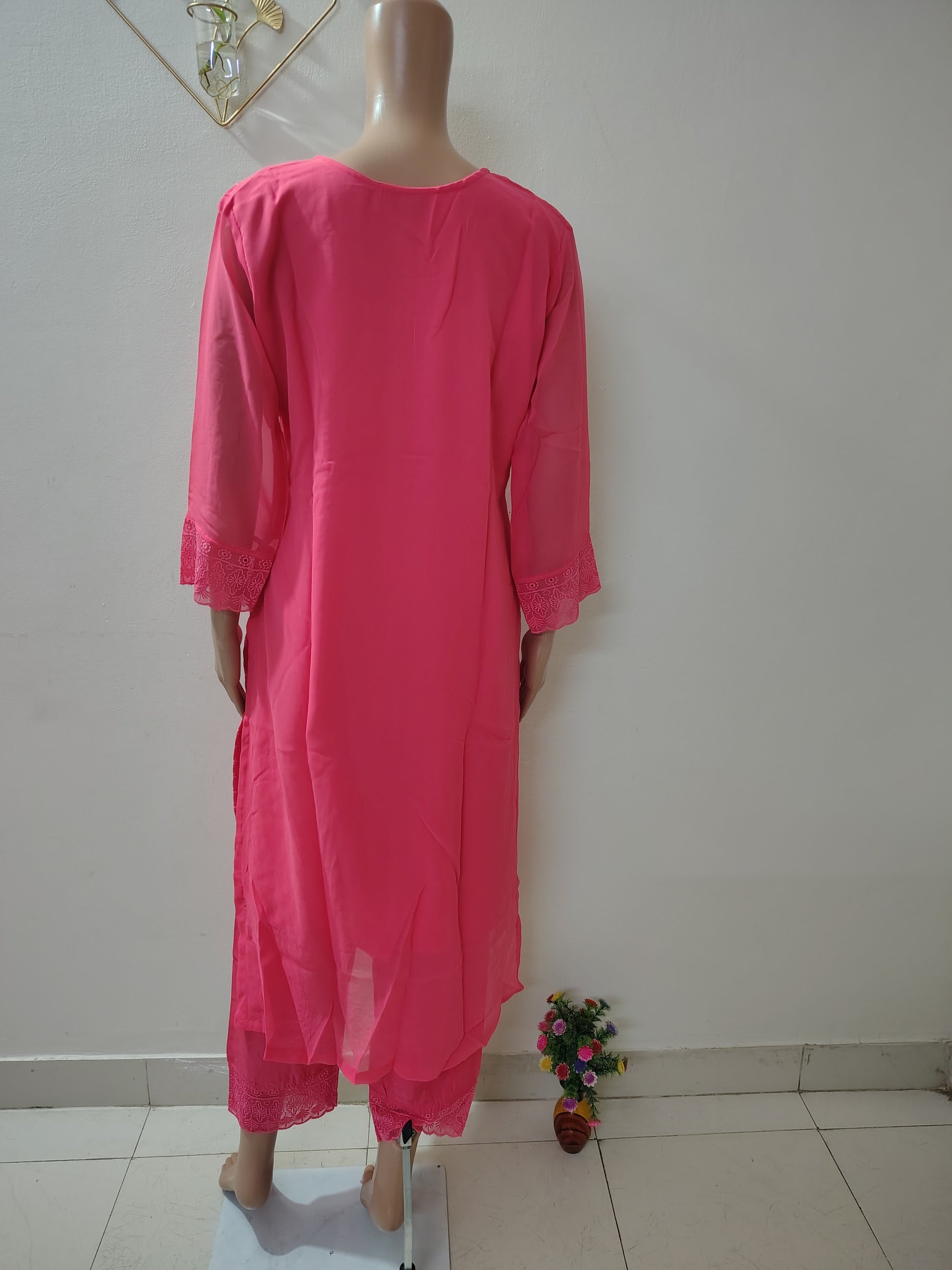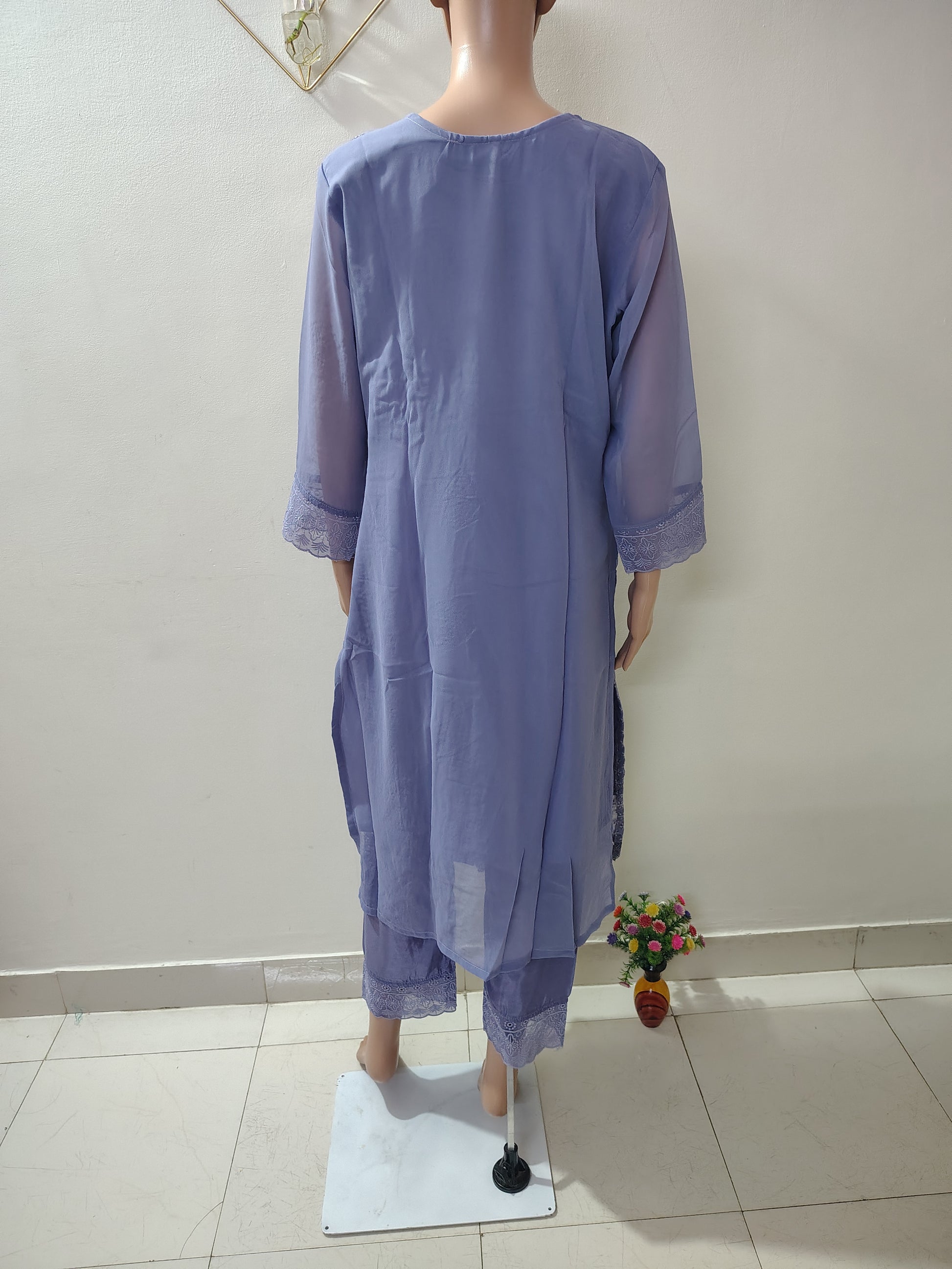 Elevate your ethnic wardrobe with this elegant ivory georgette kurta set featuring intricate thread work embroidery on the neckline. Designed with delicate lace detailing and a flowy silhouette, this premium outfit offers a graceful and feminine look. The soft georgette fabric ensures lightweight comfort, making it perfect for festive occasions, family gatherings, parties, and special celebrations. Paired with matching bottoms and a coordinated dupatta, this timeless white ethnic set blends sophistication with modern charm.