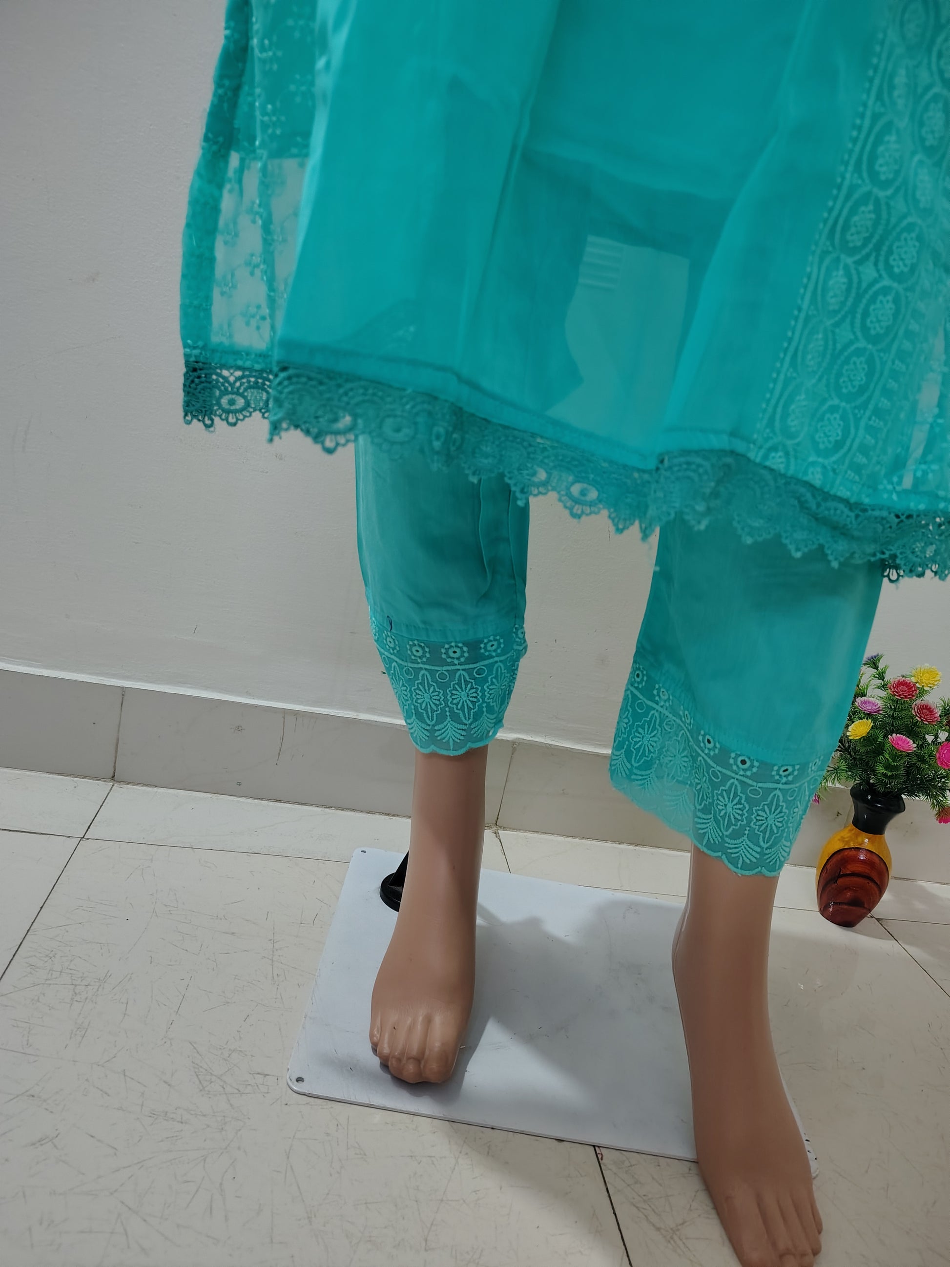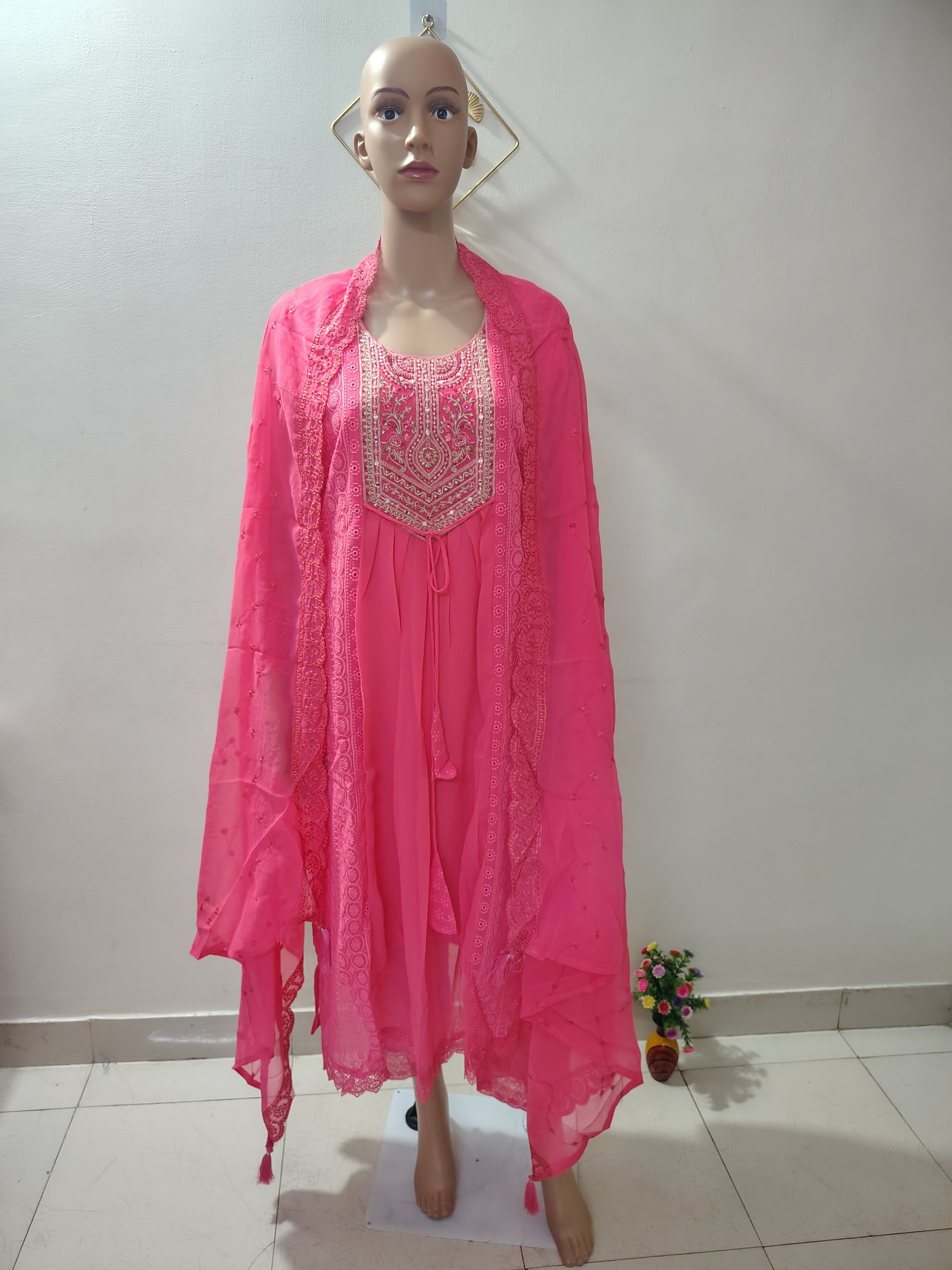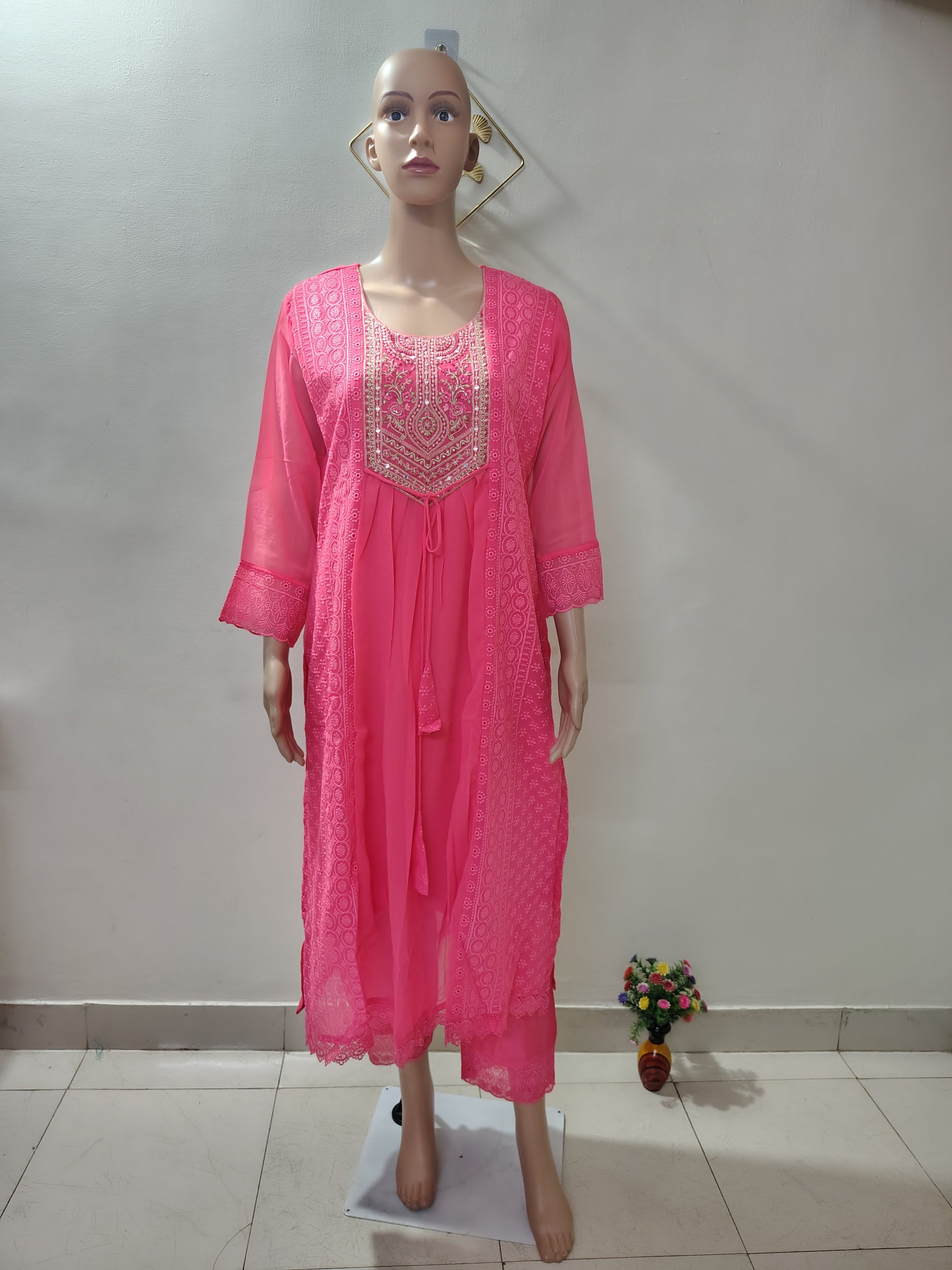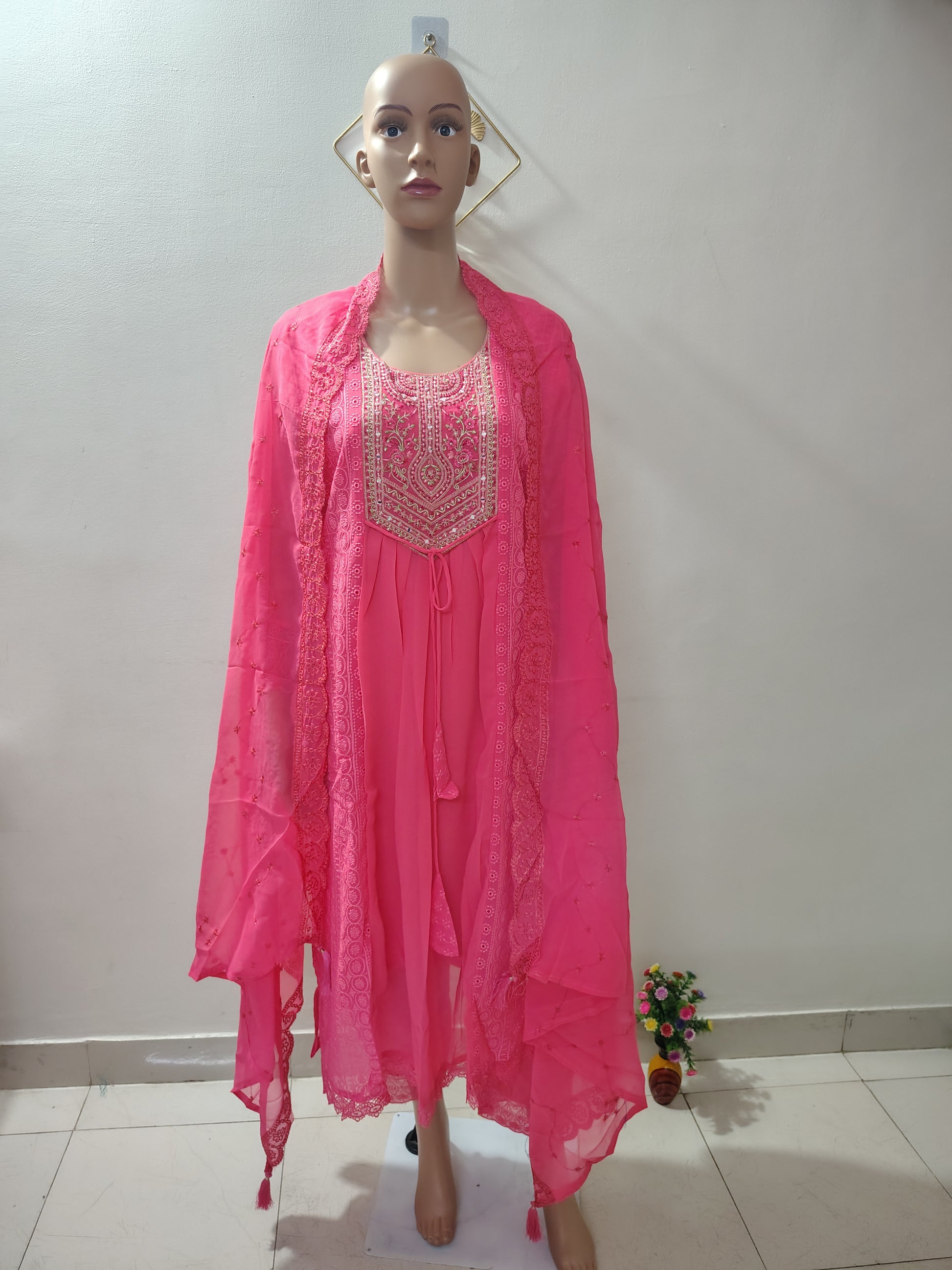 Elevate your ethnic wardrobe with this elegant ivory georgette kurta set featuring intricate thread work embroidery on the neckline. Designed with delicate lace detailing and a flowy silhouette, this premium outfit offers a graceful and feminine look. The soft georgette fabric ensures lightweight comfort, making it perfect for festive occasions, family gatherings, parties, and special celebrations. Paired with matching bottoms and a coordinated dupatta, this timeless white ethnic set blends sophistication with modern charm.