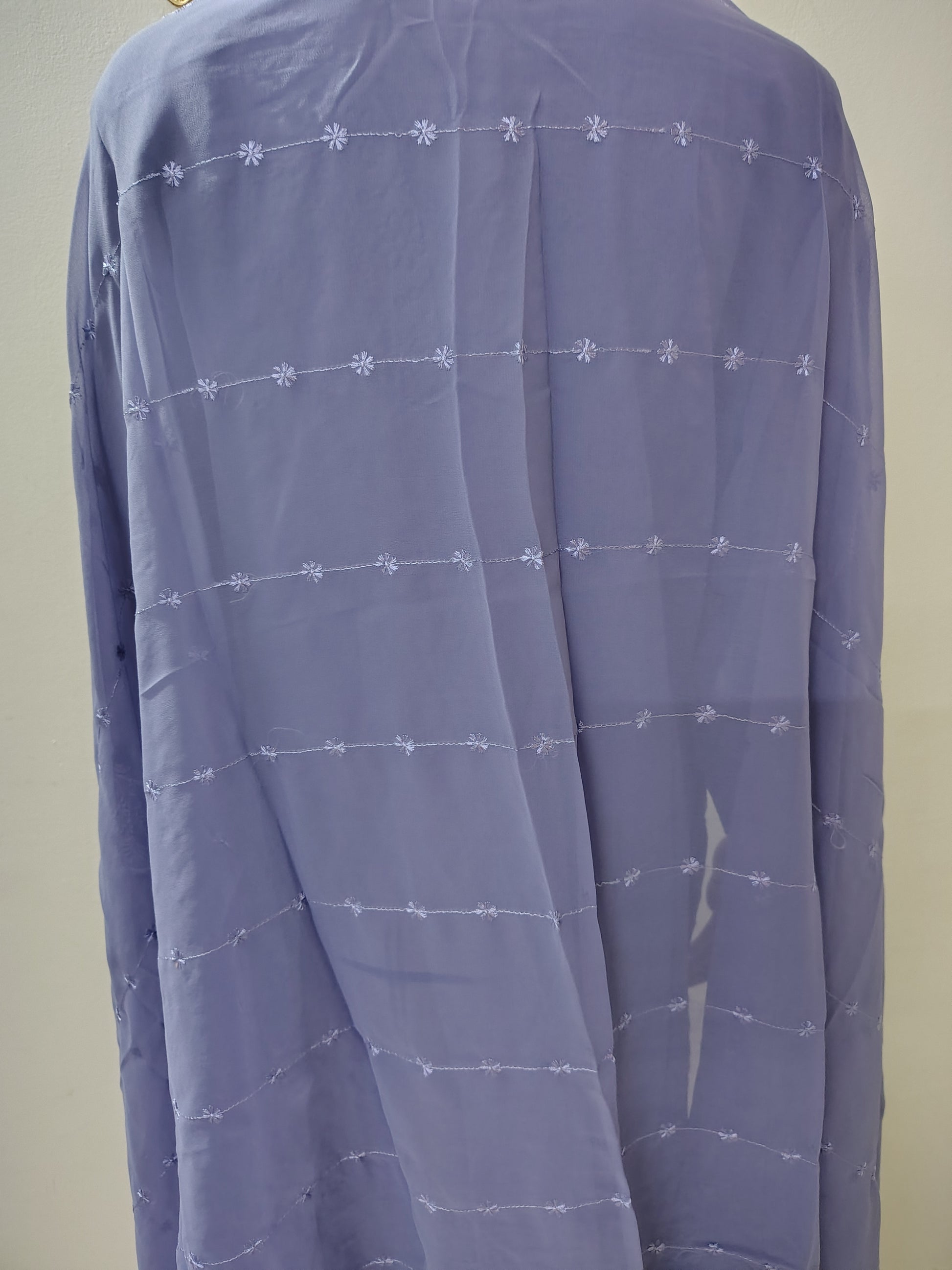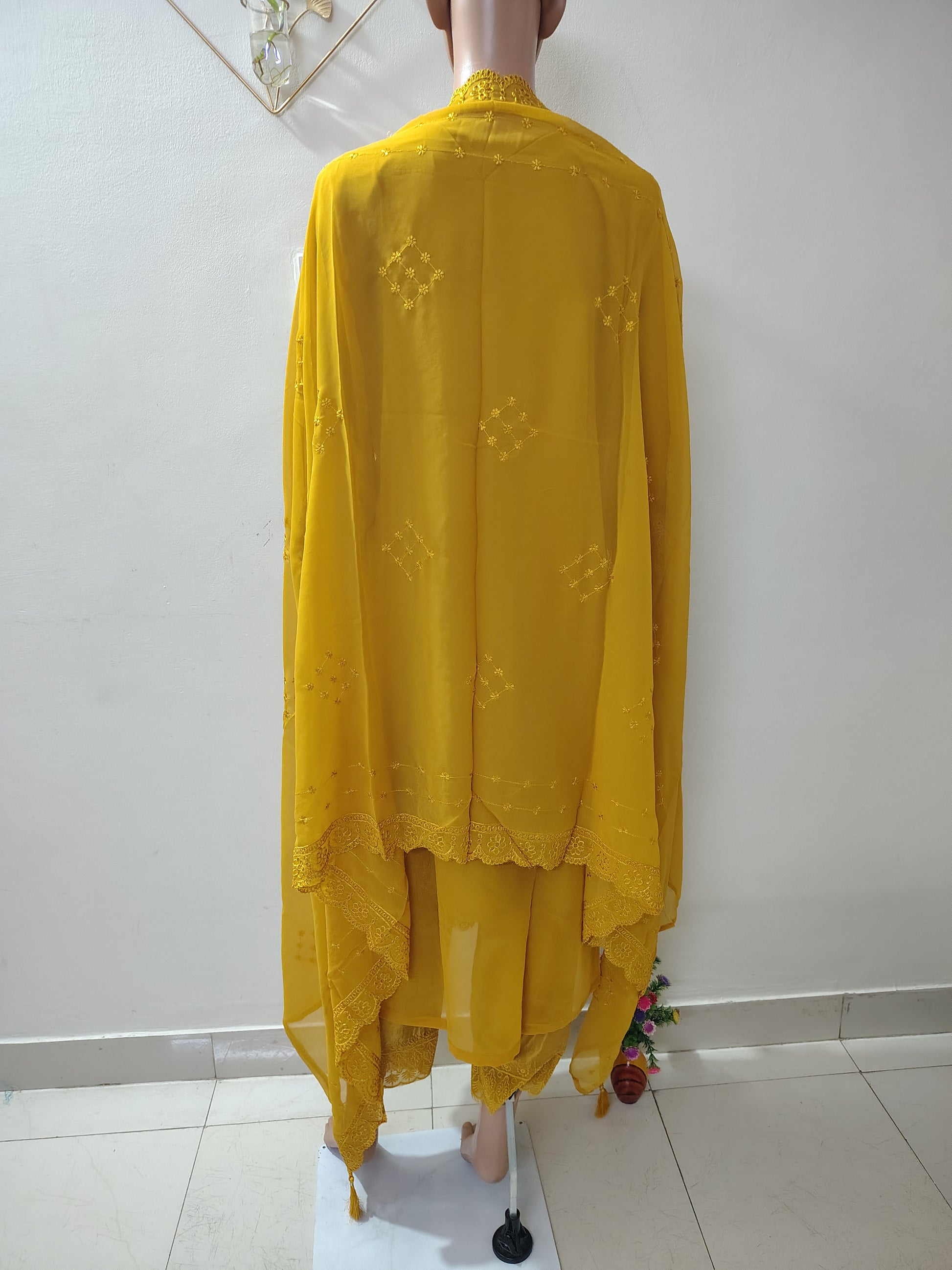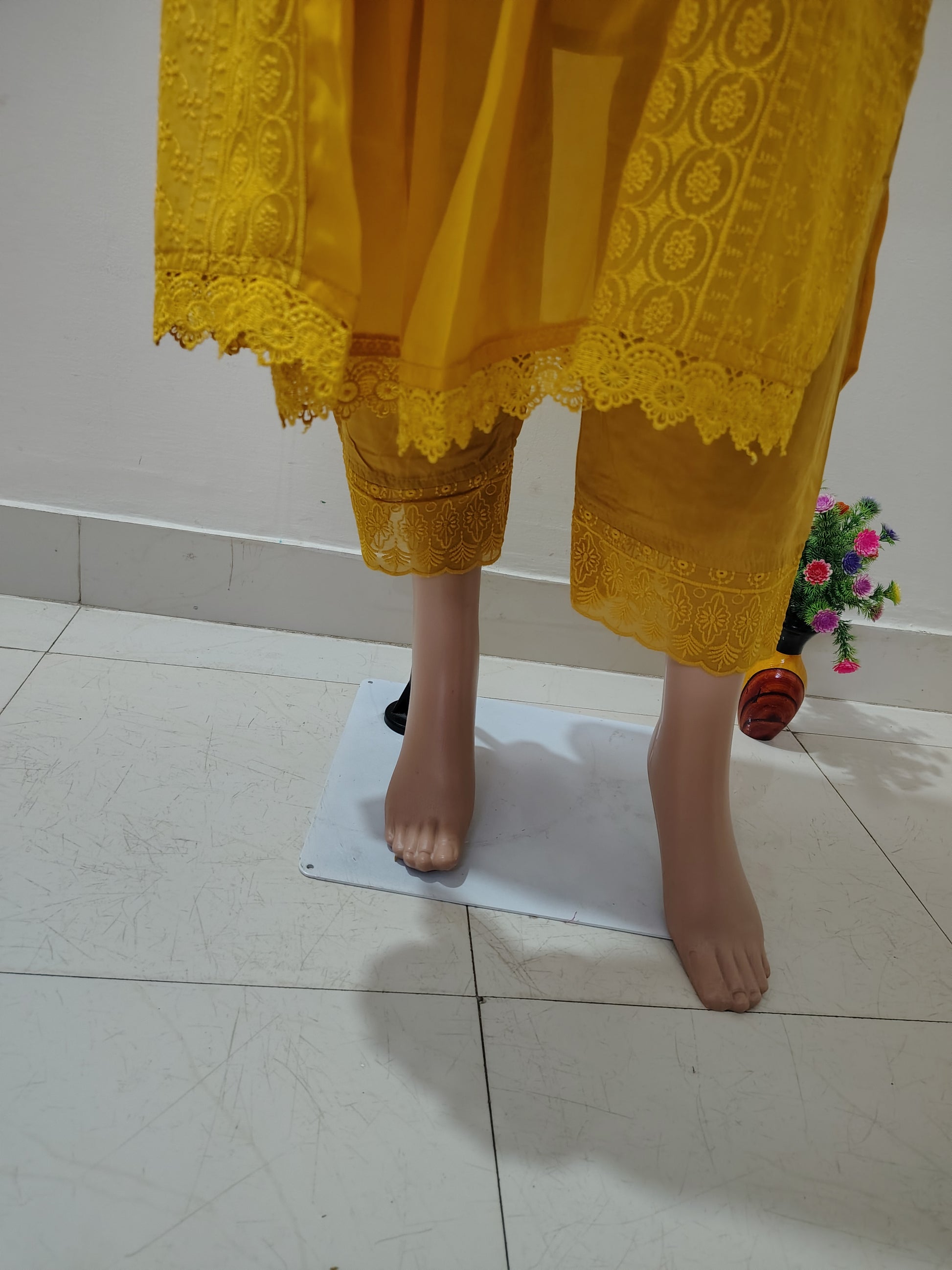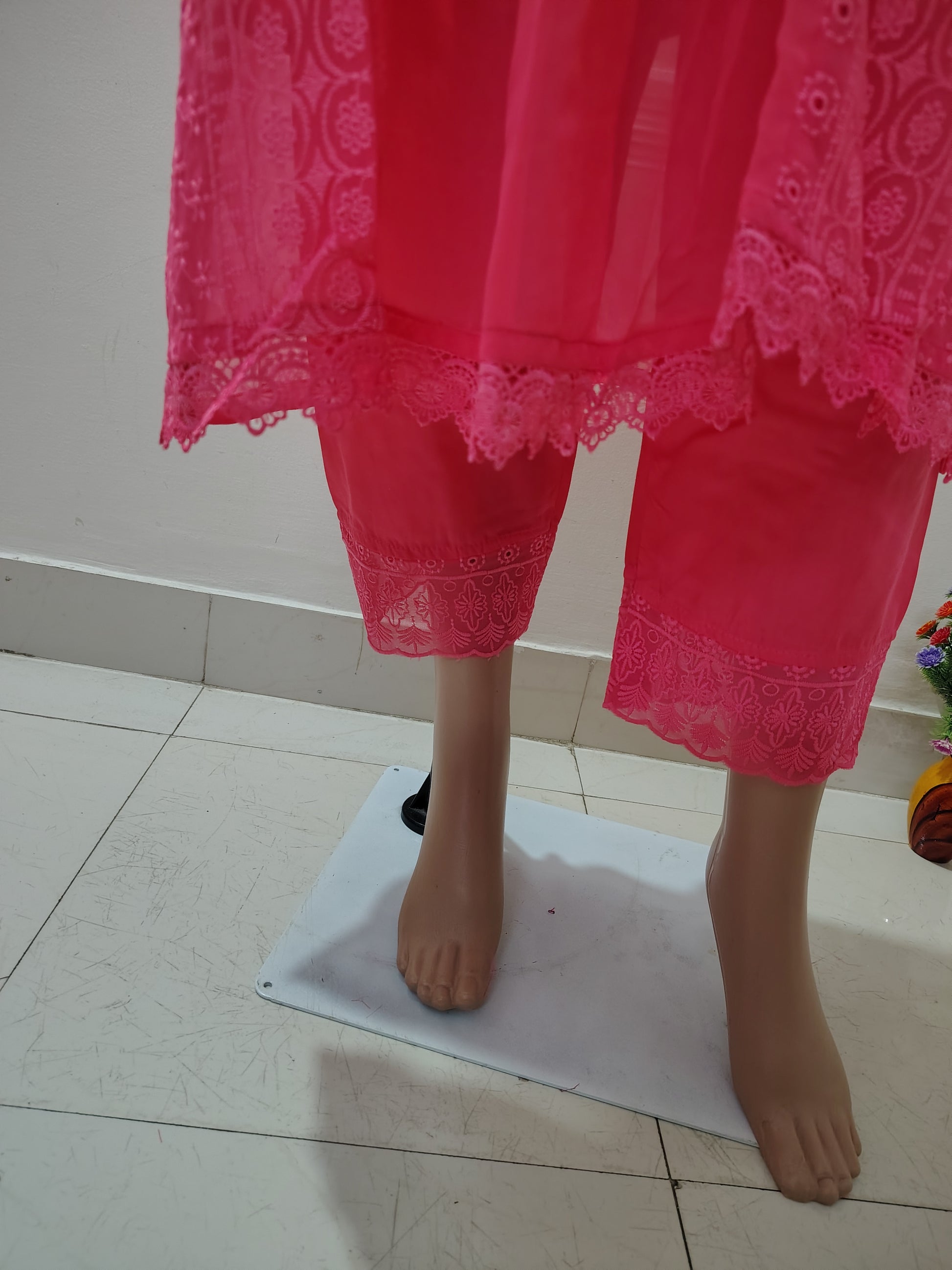 Elevate your ethnic wardrobe with this elegant ivory georgette kurta set featuring intricate thread work embroidery on the neckline. Designed with delicate lace detailing and a flowy silhouette, this premium outfit offers a graceful and feminine look. The soft georgette fabric ensures lightweight comfort, making it perfect for festive occasions, family gatherings, parties, and special celebrations. Paired with matching bottoms and a coordinated dupatta, this timeless white ethnic set blends sophistication with modern charm.