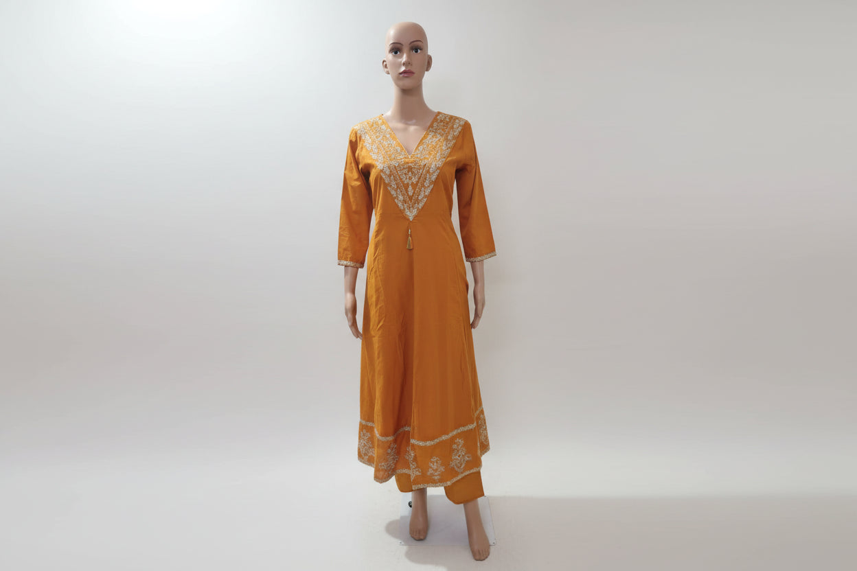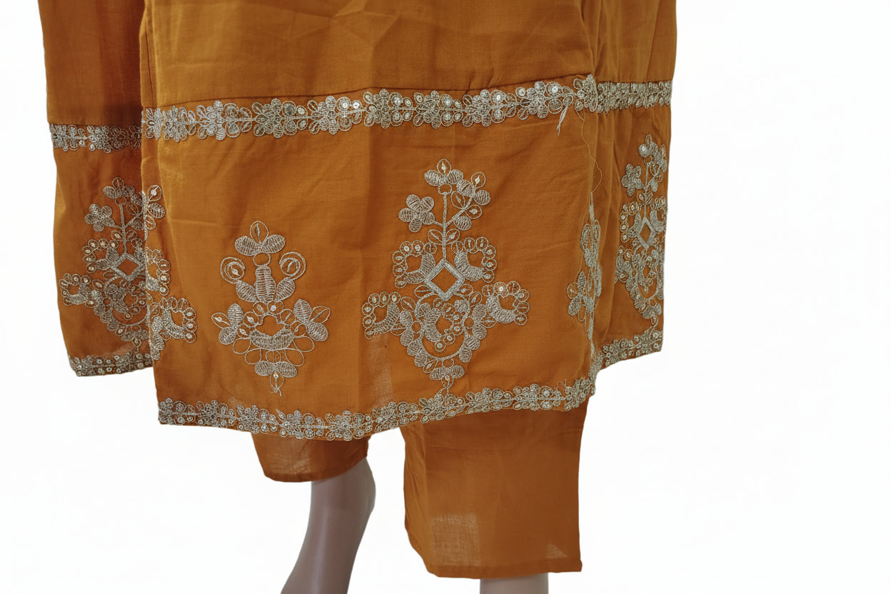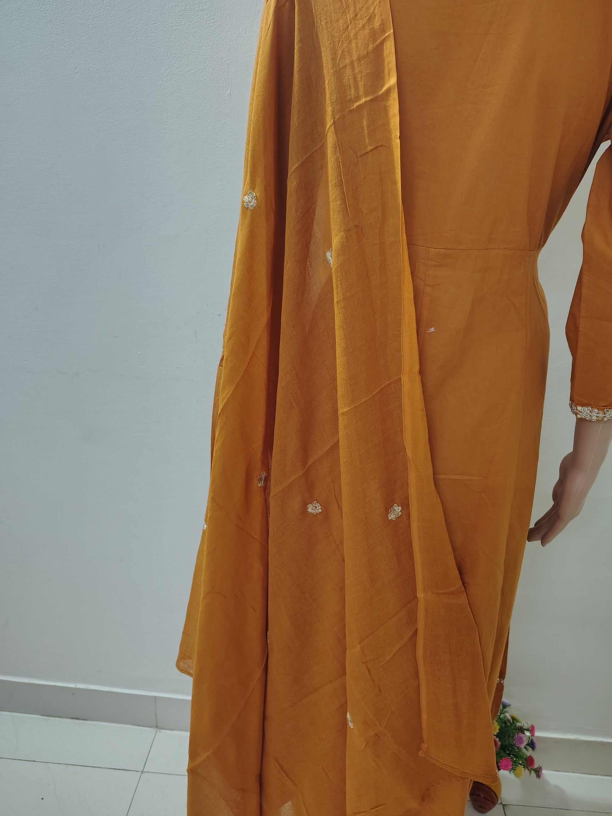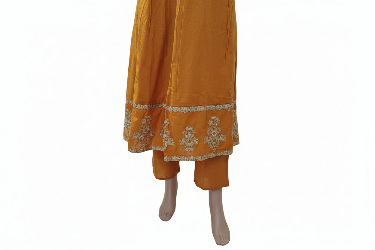 Rust Orange Embroidered Anarkali Kurta Set Elevate your festive wardrobe with this exquisite Anarkali kurta set, crafted for the discerning Indian woman who values both tradition and contemporary comfort. The rich Rust Orange hue serves as a canvas for intricate golden thread embroidery adorning the neckline and hem, creating a regal aesthetic perfect for weddings, festivals, pujas, and celebrations. The gracefully flared silhouette of the Anarkali design flatters all body types while allowing unrestricted movement throughout your event. Paired with a coordinating dupatta, this three-piece ensemble offers versatile styling options. The meticulous embroidery work reflects authentic craftsmanship, ensuring your special occasion attire stands out with understated elegance and timeless appeal.