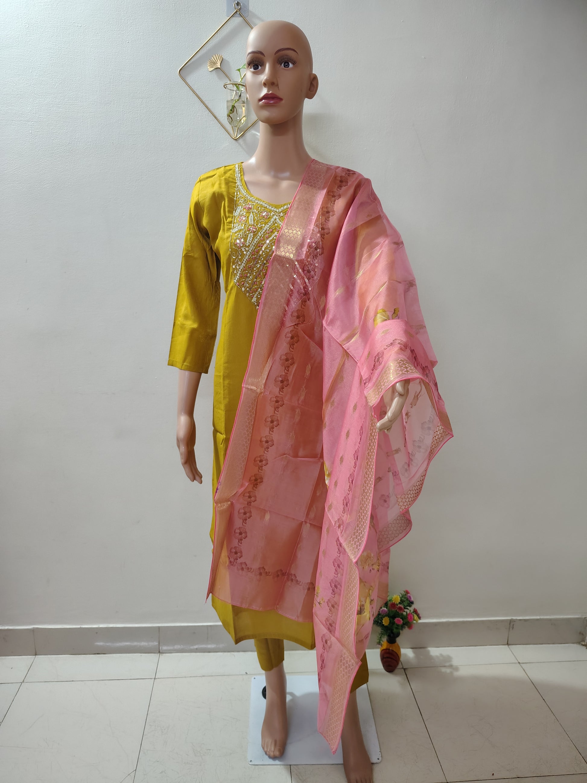 - COLOR -Mustard Yellow with Pink Contrast Dupatta